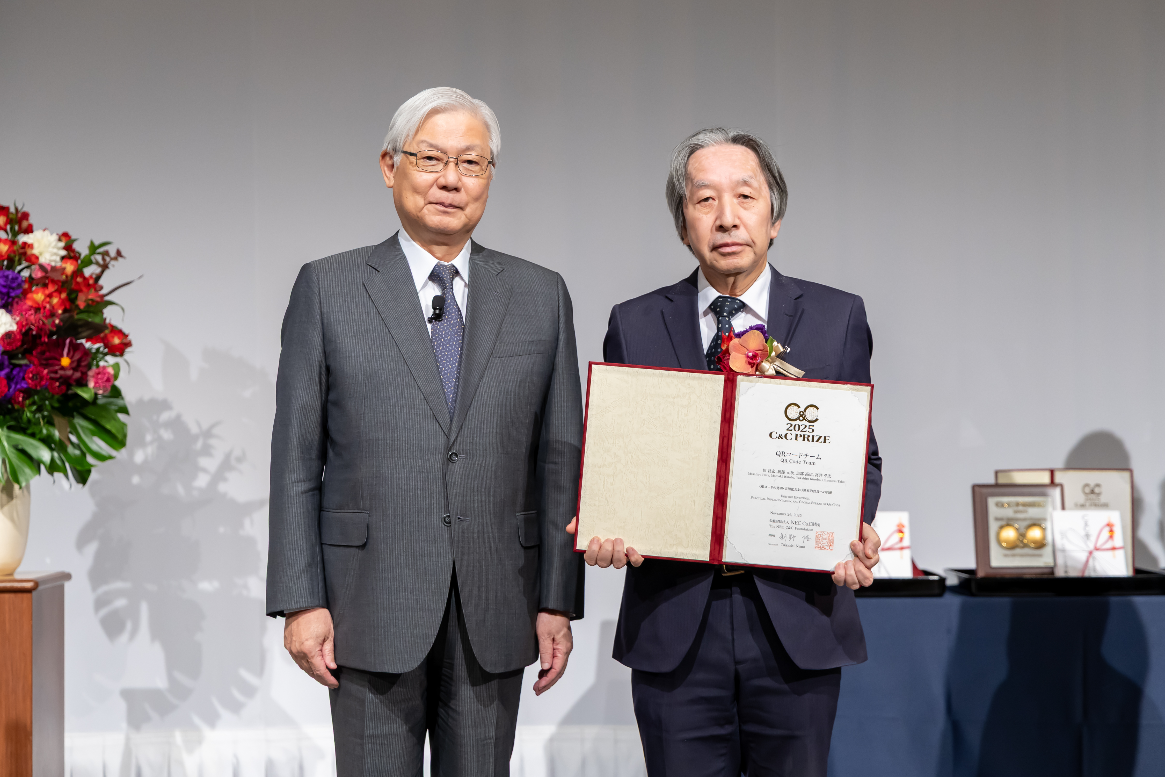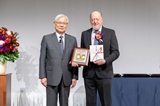 続いて、C&C賞贈呈に移り、新野 理事長から、グループAのQRコードチームのメンバー4人に賞状と、チームを代表して原様に賞牌と賞金目録が贈呈され、続いて、グループBのJack Dongarra様に賞状と賞牌、賞金目録が贈呈されました(写真4, 5, 6, 7, 8, 9, 10)。