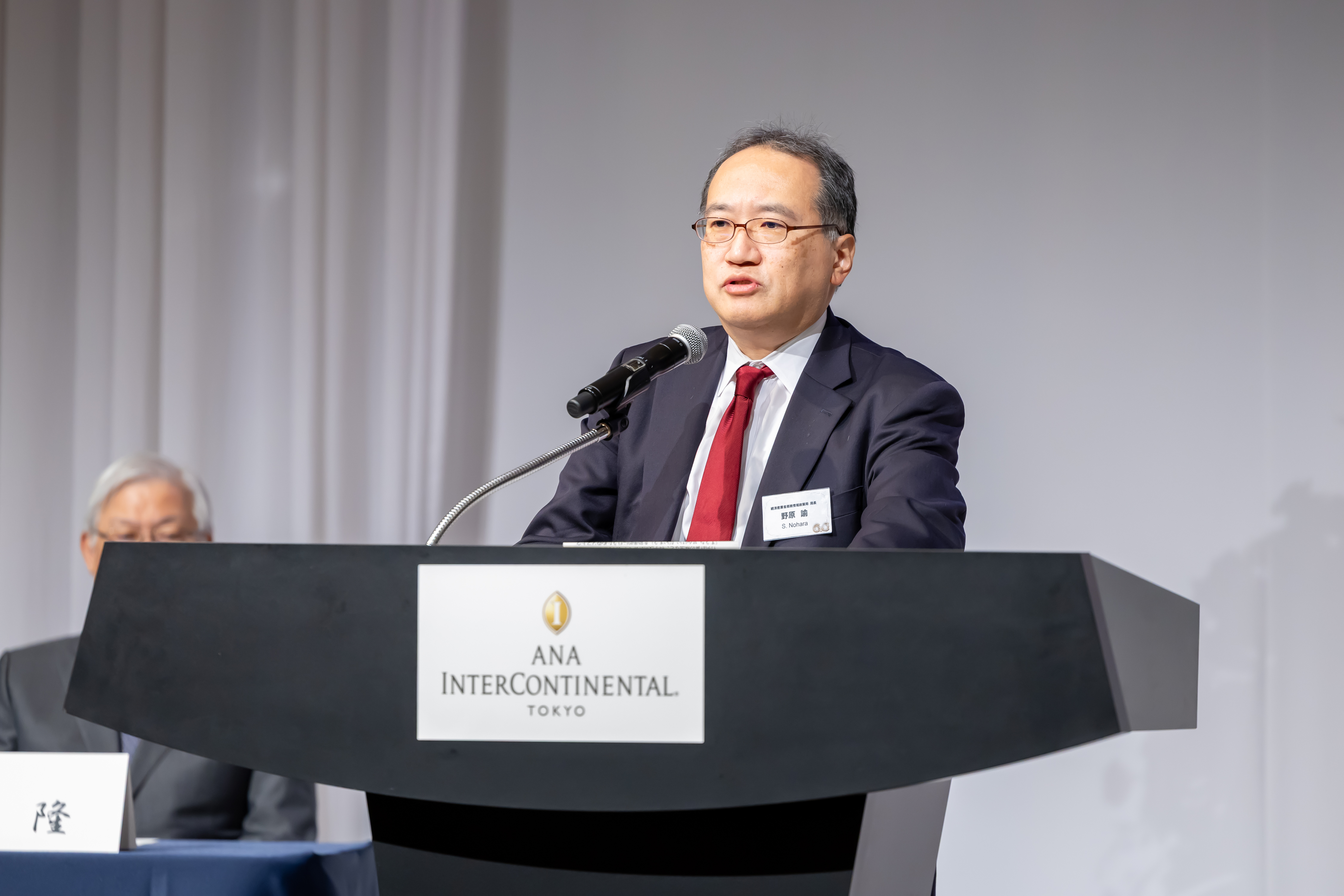 贈呈式に続き、ご来賓から祝辞を賜りました。経済産業省商務情報政策局 局長 野原諭様(写真11)からは、QRコードは今日の生活を便利にした素晴らしい技術であり、Dongarra様は高性能計算分野の数理、実装両面における社会的リーダーとして認められていると、両受賞者の業績を称えるとともに、政府の政策として、AI・半導体などの17の戦略分野について必要な支援投資を続けるとお言葉をいただきました。電子情報通信学会 会長 植松智彦様(写真12)からは、QRコードの社会的普及や、LINPACK・TOP500による科学技術計算の高度化への貢献の大きさを挙げて、両受賞者の業績を称え、また、情報通信技術や計算科学が電子情報通信学会の中核分野であること、個人的なエピソードも交えて技術の進展を紹介し、受賞者の今後の更なる活躍を祈念していますと祝辞を締めくくりました。
