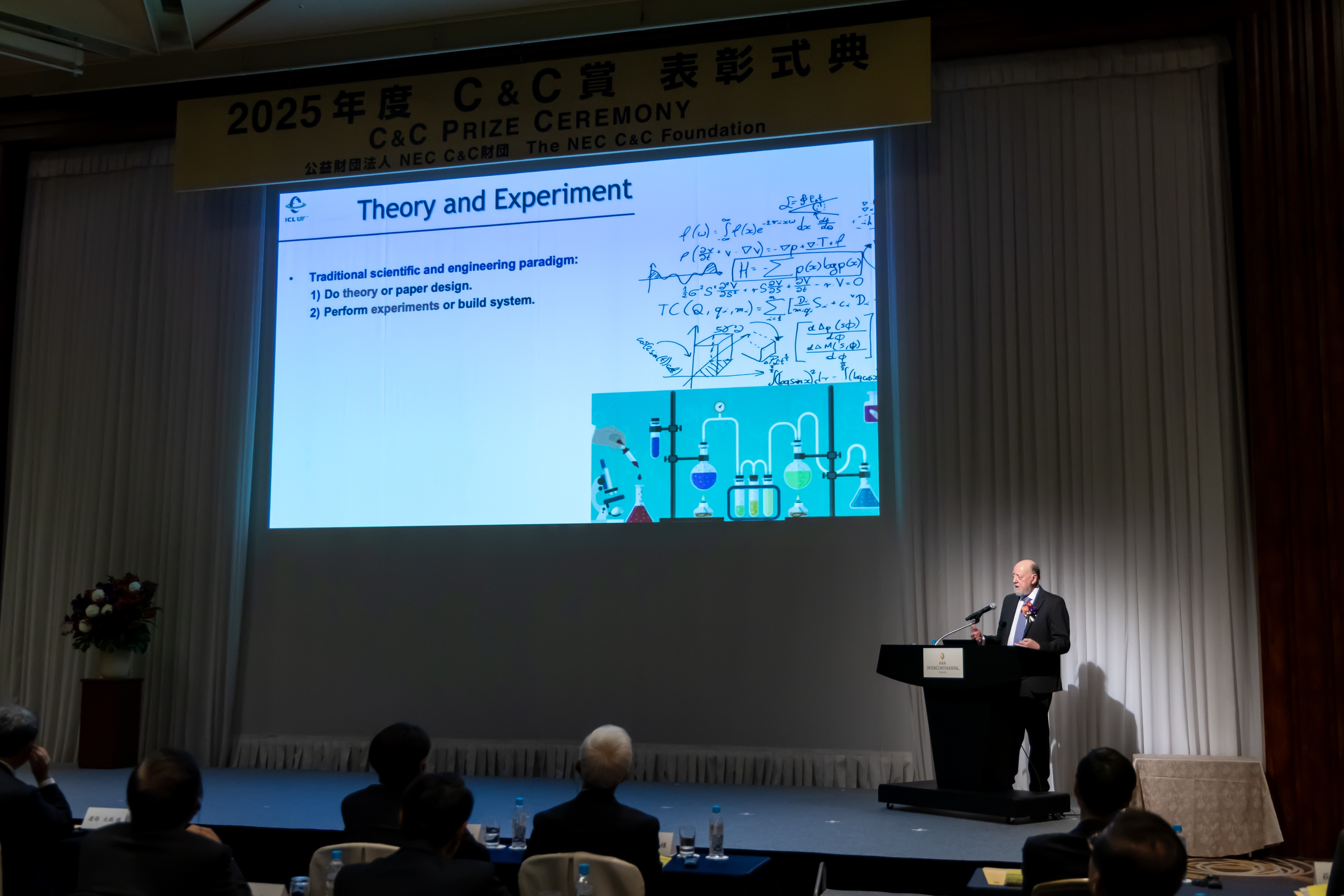 2025年11月26日、ANAインターコンチネンタルホテル東京(東京都港区)にて、2025年度 C&C賞表彰式典を執り行いました。表彰式典会場(写真1)には43名が出席、そして、11名がオンライン視聴しました。 贈呈式は午後3時から、新野隆 理事長(写真2)による開会の挨拶で始まりました。挨拶のなかで、財団の主要な活動が紹介され、C&C賞は1985年の表彰開始から今年で41回目を迎え、過去81グループ128名と1グループを表彰と説明がありました。